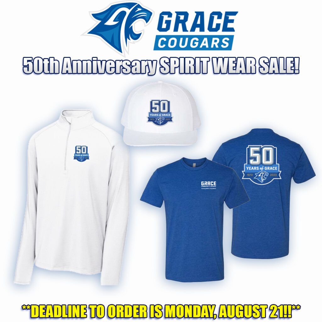 Grace Community School is celebrating a significant milestone: our 50th anniversary! We have a special edition of 50th-anniversary merchandise to mark this special event and welcome our community to purchase the hat, t-shirt, and pullover.  All items will be delivered to the campus you select after Labor Day.
