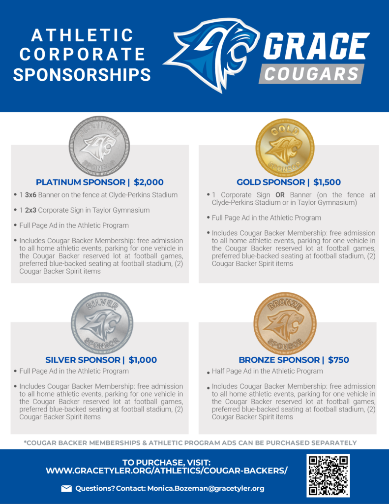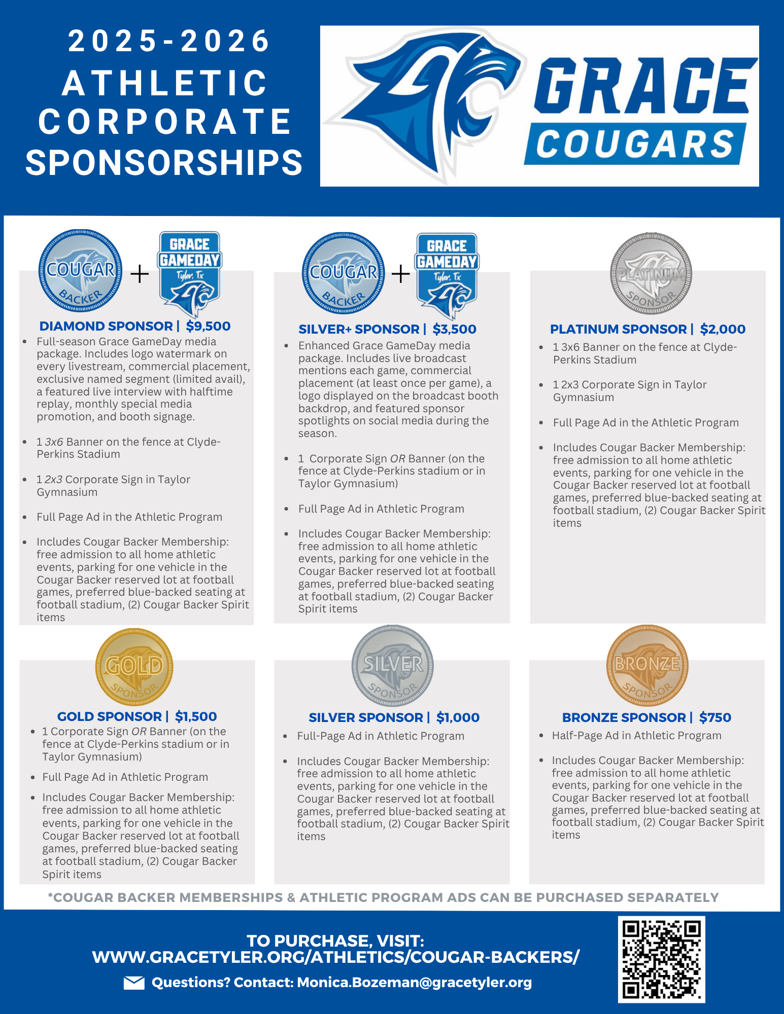 IT’S A GREAT TIME TO BE A GRACE COUGAR! Our high school is celebrating a top 3 finish in the TAPPS 5A State Overall Championships. The gyms and fields have been busy all summer with activities as our student-athletes have been working incredibly hard to prepare for successful seasons. We encourage all Cougar fans to join the 2025-2026 Cougar Backers to ensure you don’t miss a minute of the fun and fellowship. We also hope you will consider one of our sponsorship opportunities to show your support for Grace Athletics and to help us offer our student-athletes the best athletic program possible.