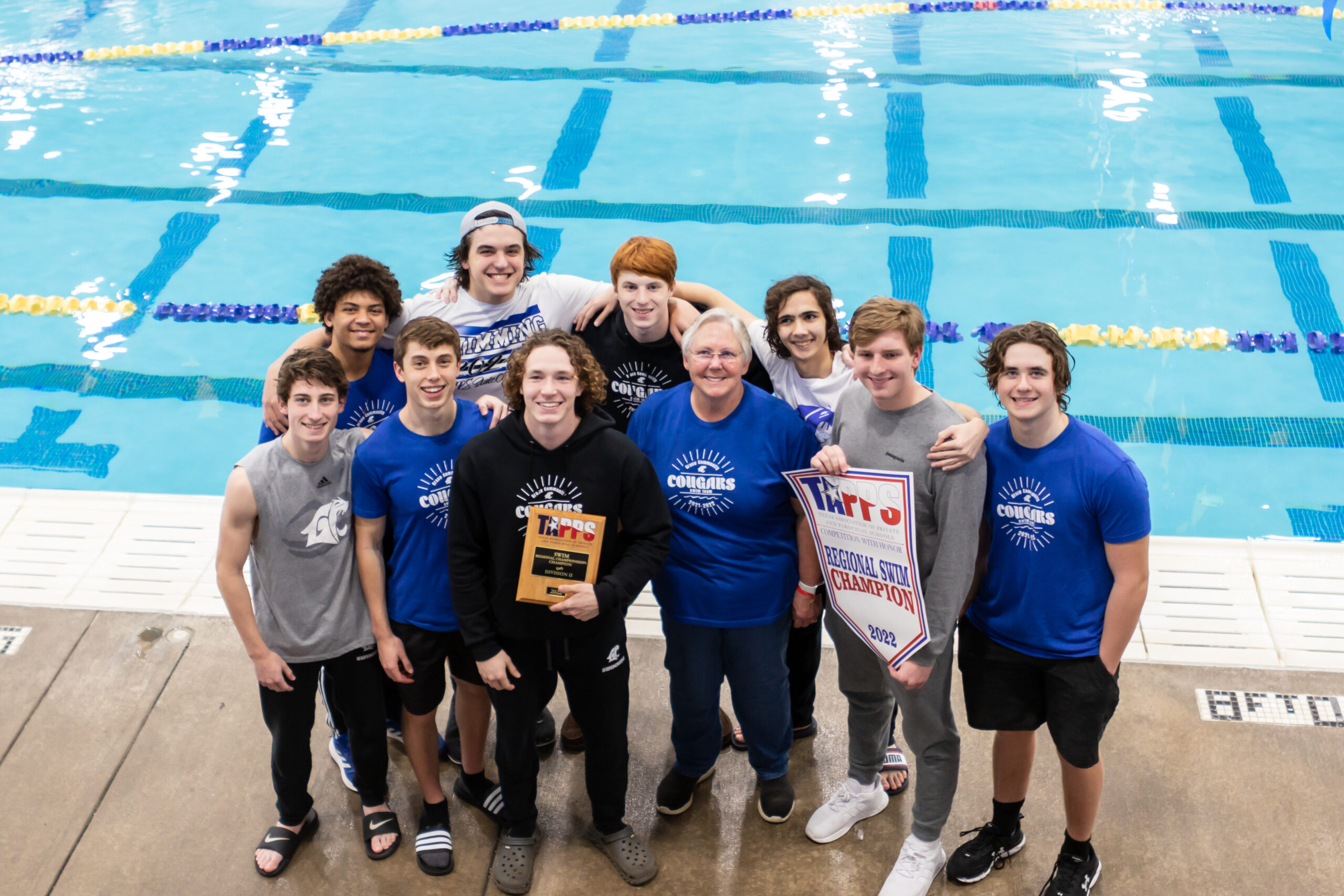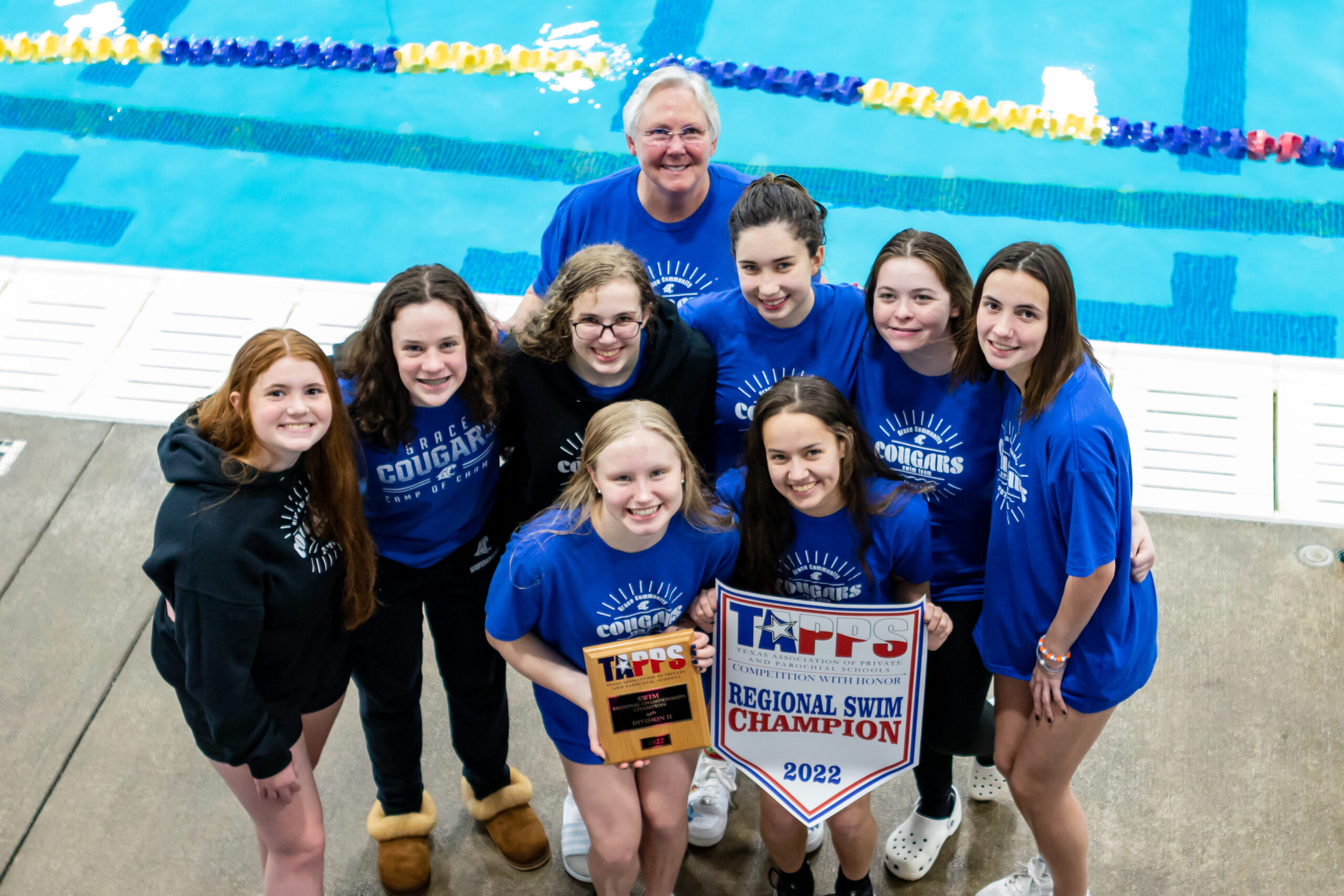 On Tuesday February 9th, the Grace Community women’s team brought home the 2nd place trophy. The girls team held a solid 2nd place position behind TMI with a score of 282.5 to 225 and Frassati Catholic at 188. The girls team also brought home gold in the 200 yard Freestyle Relay with a time of 1:49.10 and silver in the 200 yard Medley Relay with a time of 2:01.35. Senior Talia Thompson led the girls with a second place finish in the 50 free and a 3rd place in the 100 yard freestyle. The Cougar swimmers had an outstanding meet setting 7 new school records. Three Junior and Swimmers were also selected to the Academic All-State Team: Talia Thompson, Liligrace Bazzell and Kaden Kozsuch.