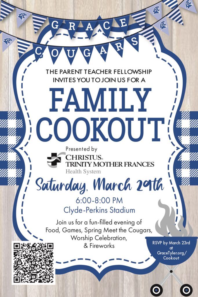 The Parent Teacher Fellowship (PTF) of Grace Community School invites you to the Grace Family Cookout on Saturday, March 29th, from 6:00 – 8:00 pm. at Clyde-Perkins Stadium.