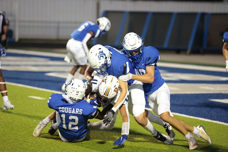 Things did not start as the Cougars would have liked, however.  Bad snaps, special teams miscues, and an interception all contributed to Brook Hill taking a 13-0 lead in the 1st quarter.  The defense, though, played extremely well, holding strong against the Guard offense in difficult circumstances and ensuring the game stayed close.  Thanks to this great defensive performance, Brook Hill didn’t score another point in the 1st half and the Cougars went in at halftime only down by 13.
