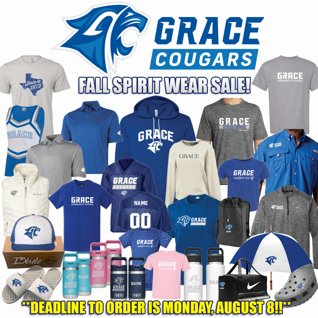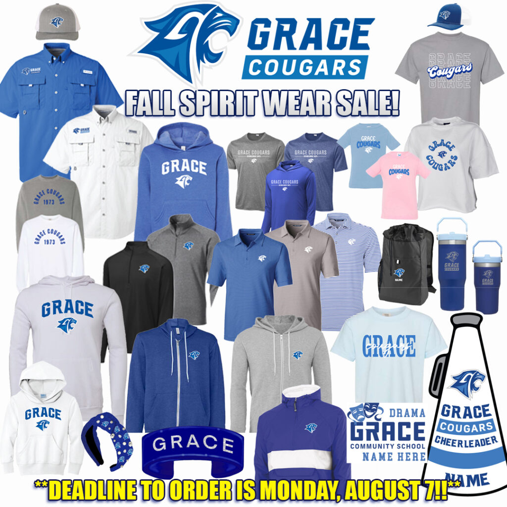 Time to get your Grace Cougar spirit on! Pre-order your 2023-2024 Fall Spirit Wear now. We are using Pay It Forms so select your sizes and quantities. Please know that some items have a limited quantity so shop early! There is a $6.00 handling fee that will be added to your order. Spirit wear purchases will be delivered to the campus of your choice after Labor Day. We hope you enjoy shopping!