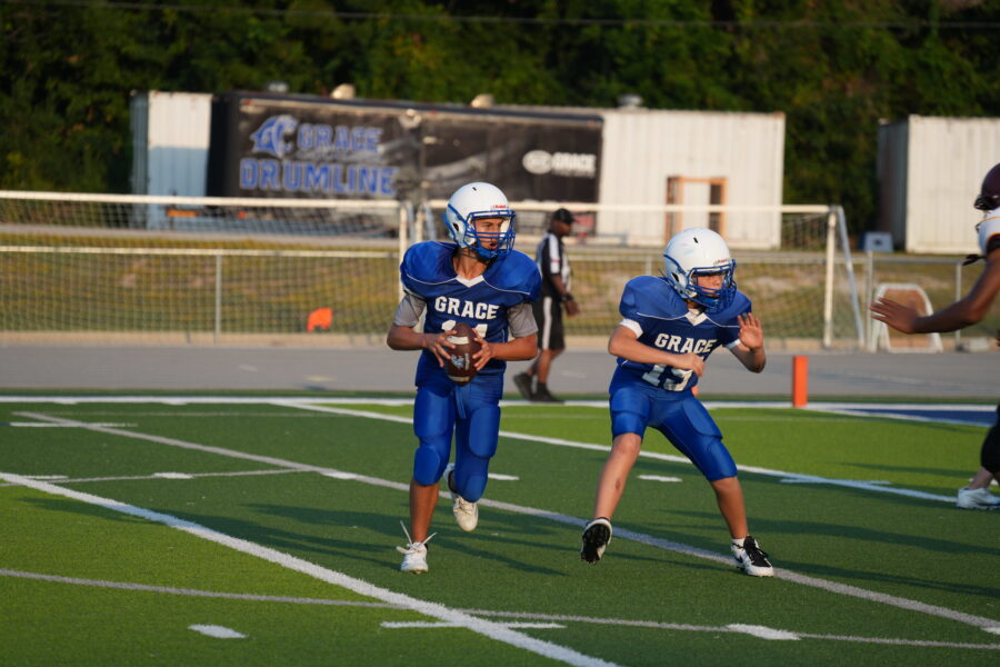 The Cougars’ offense found rhythm early behind Moore’s steady hand. The eighth grade quarterback connected with Skylar McGee for a 34-yard touchdown strike in the first half, putting Grace on the board after a back-and-forth opening quarter. McGee finished with 2 catches for 60 yards and a touchdown, providing a crucial spark whenever the Cougars needed a big play.