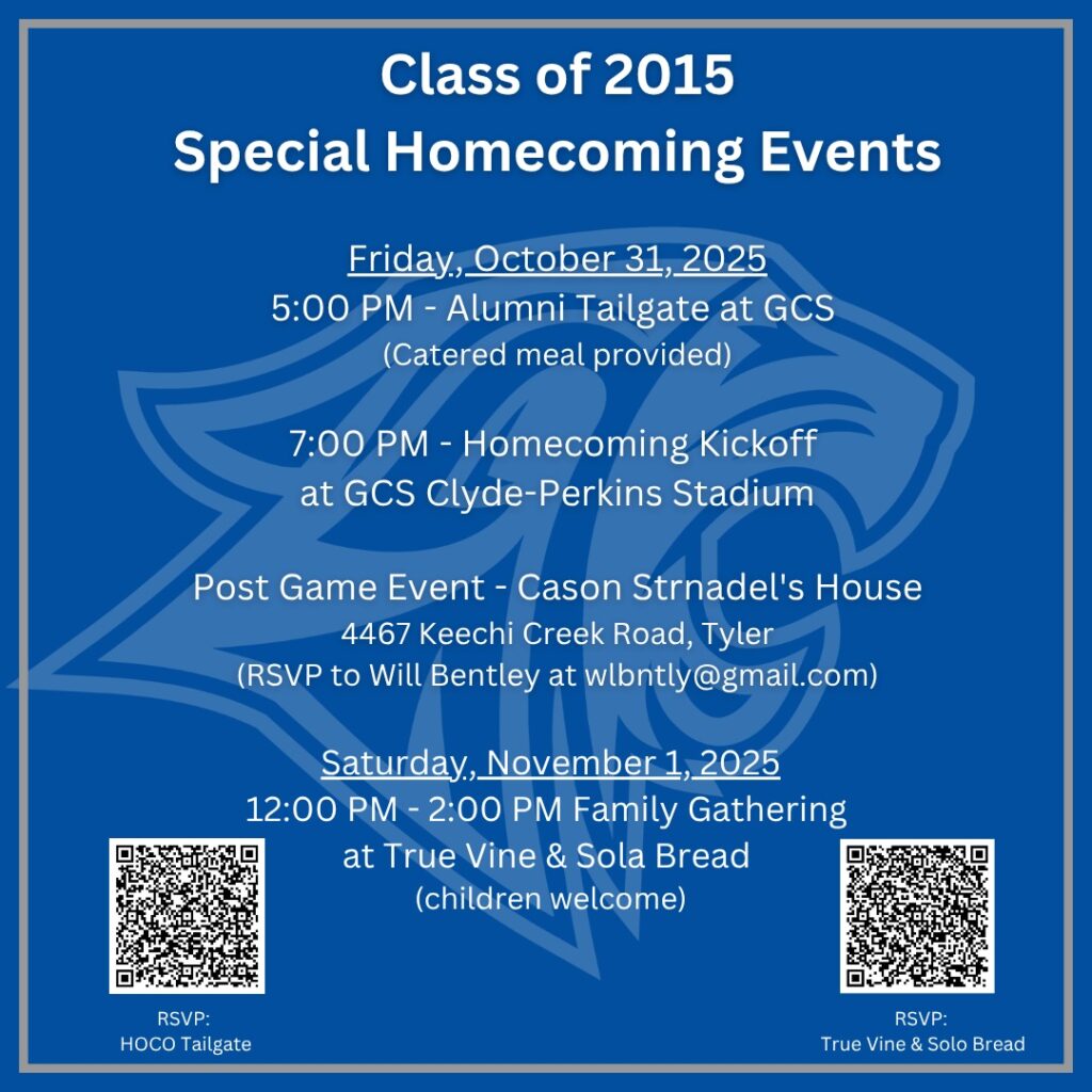 We are excited to have a GCS Alumni tailgate for all former students and alumni parents this year! Don’t miss this opportunity to see old friends, teachers, and coaches at Homecoming 2025! Please click here to RSVP BY OCTOBER 26th so we can ensure an accurate food count for everyone.