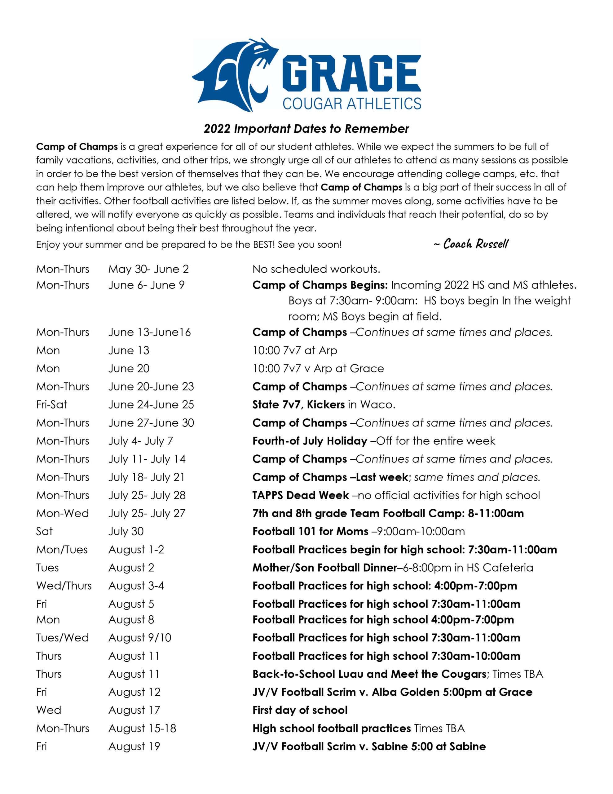 Other football activities are listed here. If, as the summer moves along, some activities have to be altered, we will notify everyone as quickly as possible. Teams and individuals that reach their potential, do so by being intentional about being their best throughout the year.