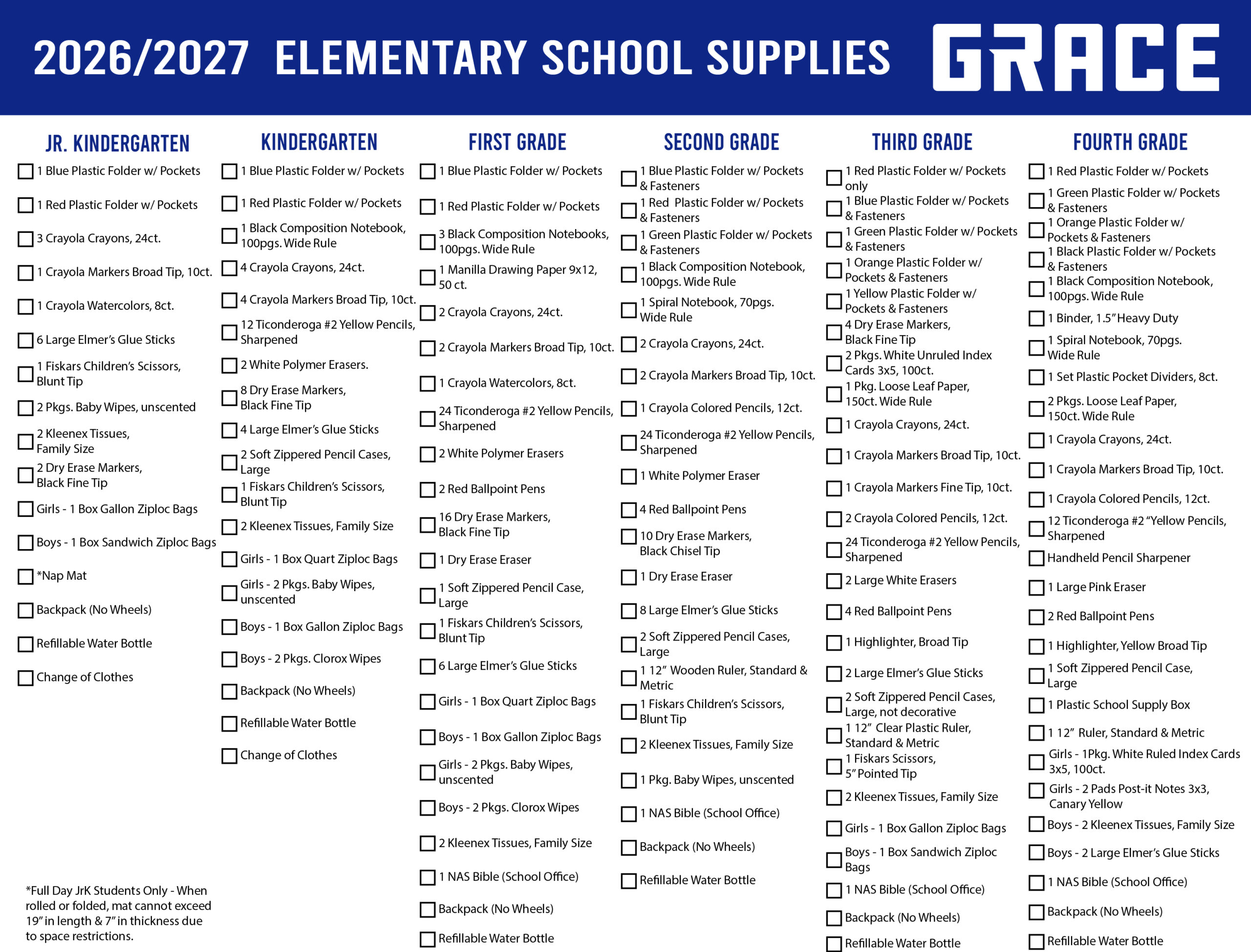- Supply lists for Elementary School, 5th & 6th Middle School, 7th & 8th Middle School, High School, and Grace U.